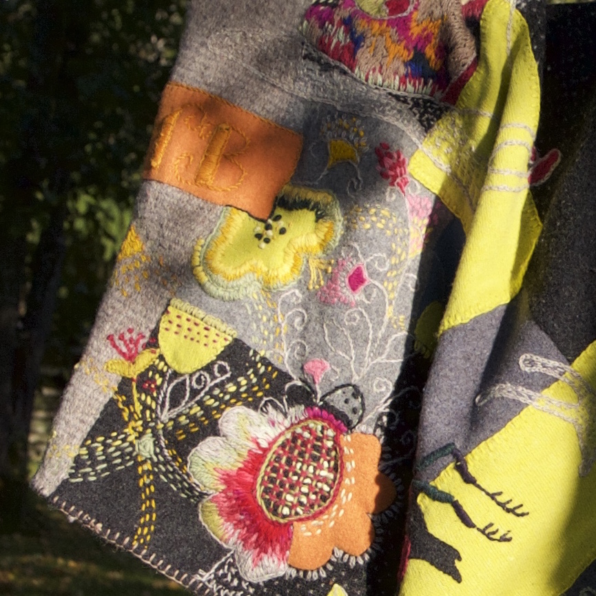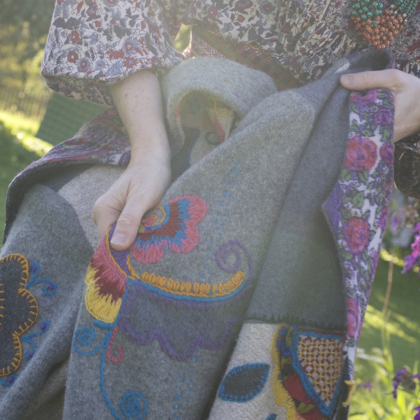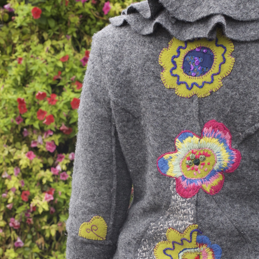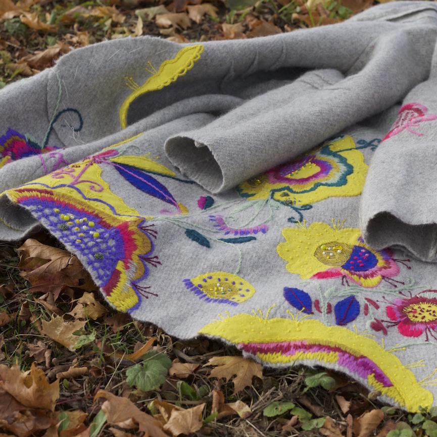 Taaskasutusest ostetud Itaalia päritolu kaunilõikeline hall mantel sai värskenduseks värvikad lilled ja lehemustrid.